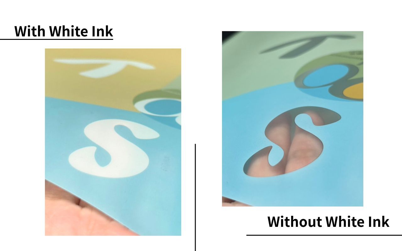Applying white ink highlights patterns and logos, making colors more vibrant and eye-catching. Without white ink, the folder maintains the semi-transparent effect of the PP material, offering a minimalist and refined appearance.