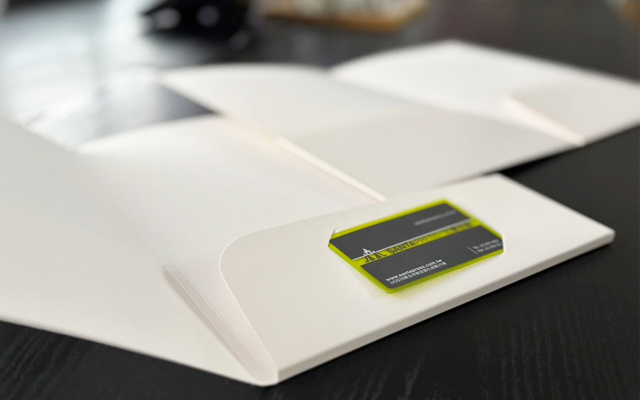A kétzsebes mappa egy beépített névjegykártya-tartóval rendelkezik, amely lehetővé teszi, hogy a dokumentumokat és a kártyákat együtt, professzionálisan mutassuk be. A kártyatartó testreszabható függőleges, vízszintes vagy különleges méretű kártyákhoz, így egy olyan mappát hozhat létre, amely a váll