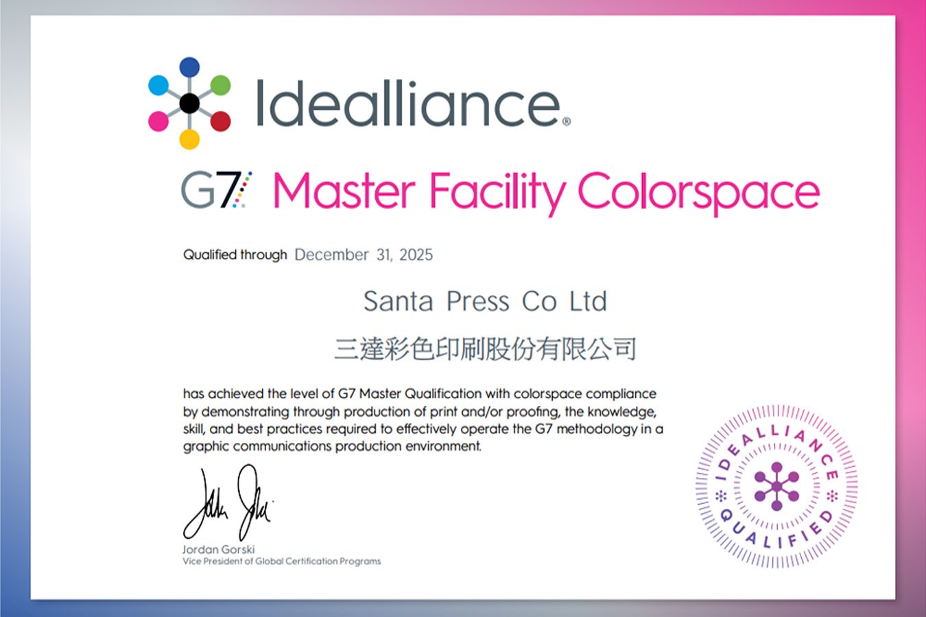 Santapress è impegnata nell'eccellenza continua, supportata dalle nostre certificazioni G7 e D-U-N-S®, che evidenziano il nostro rigoroso focus sulla qualità di stampa e sulla gestione del colore. La certificazione G7 garantisce che le nostre stampe soddisfino gli standard internazionali per la coerenza e l'accuratezza dei colori, offrendo un'uscita stabile e di alta qualità. Nel frattempo, la certificazione D-U-N-S® migliora la nostra credibilità aziendale, garantendo trasparenza e affidabilità nella catena di approvvigionamento. Ci atteniamo ai più alti standard per fornire ai nostri clienti una qualità di stampa precisa e coerente, soddisfacendo una vasta gamma di esigenze professionali.