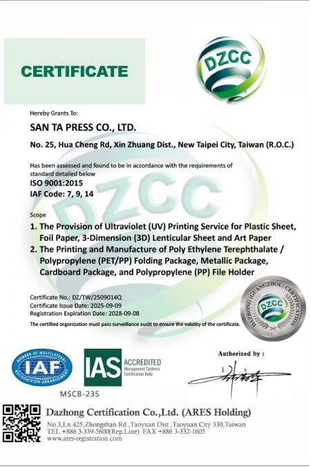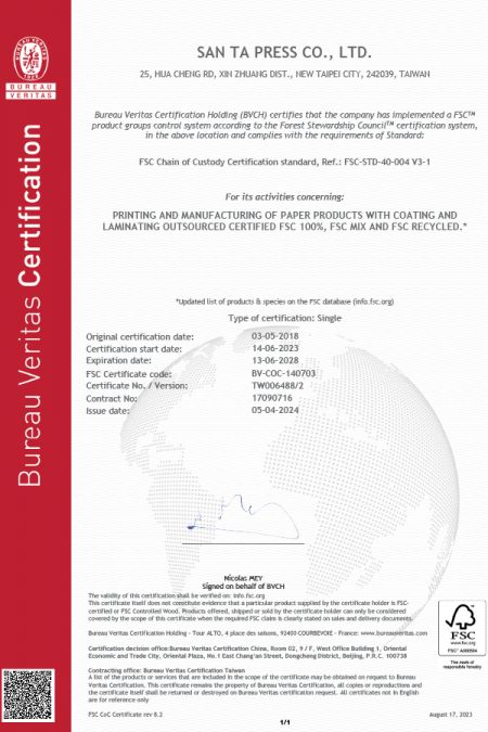 Santapress mantiene costantemente elevati standard di qualità, vantando con orgoglio numerose certificazioni internazionali, tra cui ISO 9001, TÜV e FSC®. Queste certificazioni dimostrano la nostra competenza professionale e il nostro impegno per l'eccellenza nella stampa e nella gestione della qualità. Ci atteniamo ai più alti standard per garantire la qualità, l'accuratezza e la coerenza di ogni prodotto, offrendo ai nostri clienti soluzioni di stampa e imballaggio affidabili di cui possono fidarsi.