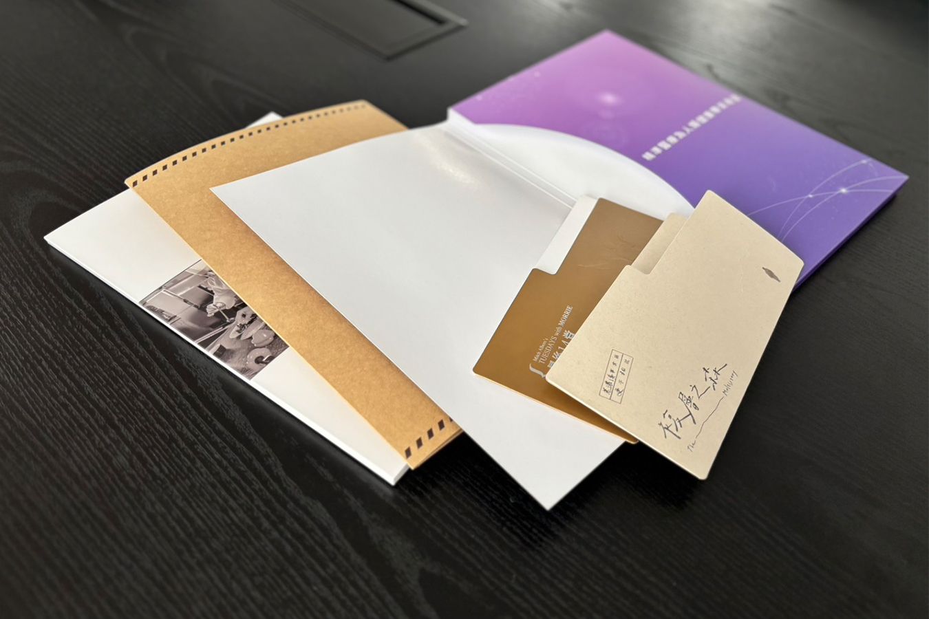 紙材可搭配燙金、打凸打凹、局部上光及名片卡槽後加工技術提升質感與專業,內頁布局讓文件分類清晰、一目了然,書背加厚設計可容納更多資料