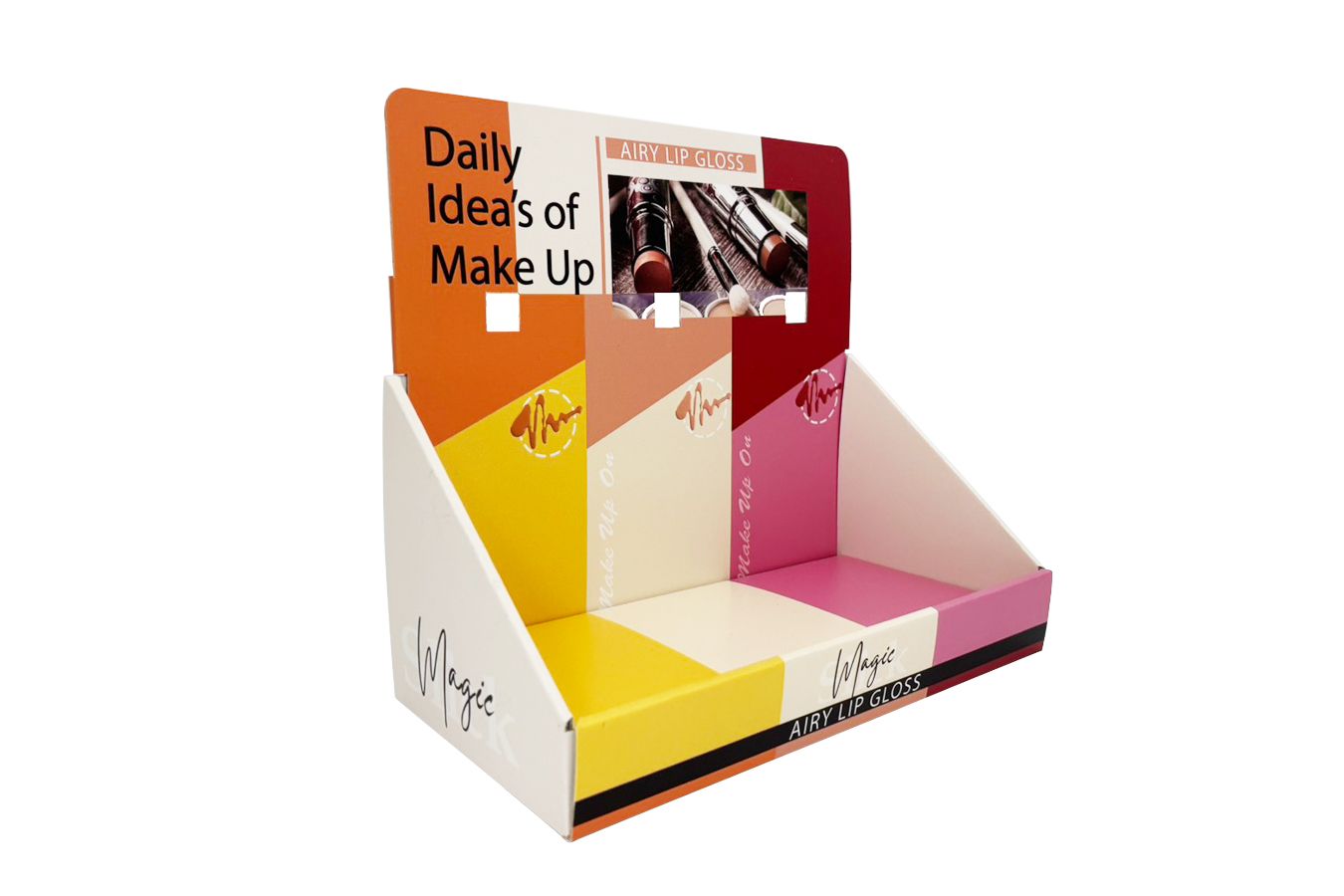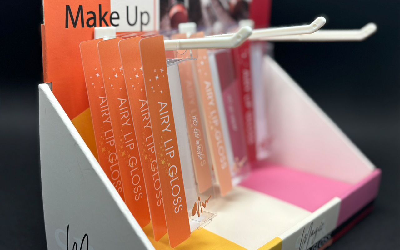 採用站立式結構搭配插槽分格設計,可牢固固定每一件商品,陳列整齊、展示穩固,整體設計可依系列產品延伸開發,搭配不同色系與風味,強化品牌系列識別與通路辨識度。背板區域可印製品牌Logo與主視覺,讓展示效果更聚焦。適用於唇膏、精華液等輕巧直立商品。