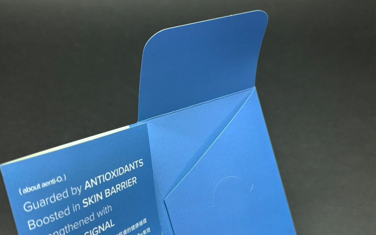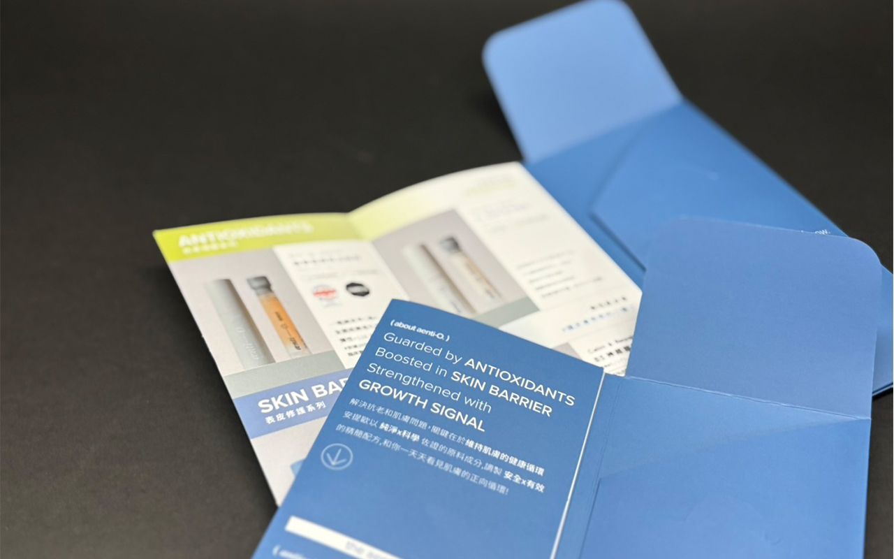 採用銅板紙製作,雙面皆可進行高品質印刷,完整呈現產品資訊、成分說明與品牌視覺,有效提升溝通效率與版面運用彈性。搭配雙面霧P加工,進一步強化防刮與耐用性,協助品牌在試用階段建立專業形象,為品牌啟動有效體驗轉換。