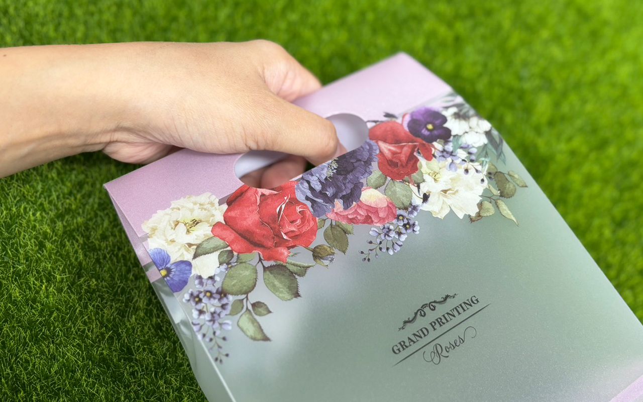 這個包裝盒三達印刷運用的是PP磨砂霧面。盒子使用微笑扣開合,一打開上蓋映入眼簾的就是注目的產品。結合上蓋手提把,省去多餘手提袋,讓產品方便提拿,成為最佳包裝選擇。封面搭配鮮豔奪目的玫瑰花襯托出盒子華貴嬌豔的特色風格。